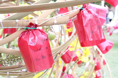 家族やカップル、海外の人など、それぞれの思いをりんごの袋に載せて、願いが叶いますようにと祈りを込めて被せていました。