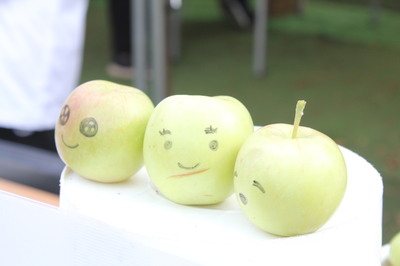 また、その隣には、「ミスグリりんごのおすそわけ」というコーナーがあり、食べられない飾り用の実選り(みすぐり)りんごがもらえ、りんごに笑顔を書いたりできます!