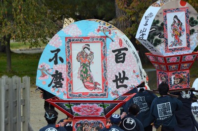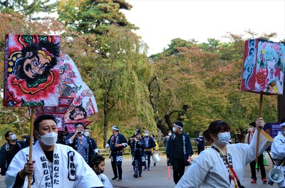 弘前ねぷたまつりの本番は8月ですが、弘前ねぷた300年祭を記念して10月29日の「弘前城菊と紅葉まつり」開会式の後、「錦秋ねぷた」が運行されました。メイン会場である植物園を出発し、弘前城天守を回り、追手門まで運行しました。長い道のりをたくさんの人々が写真やビデオを撮りながら一緒に楽しんでいました。