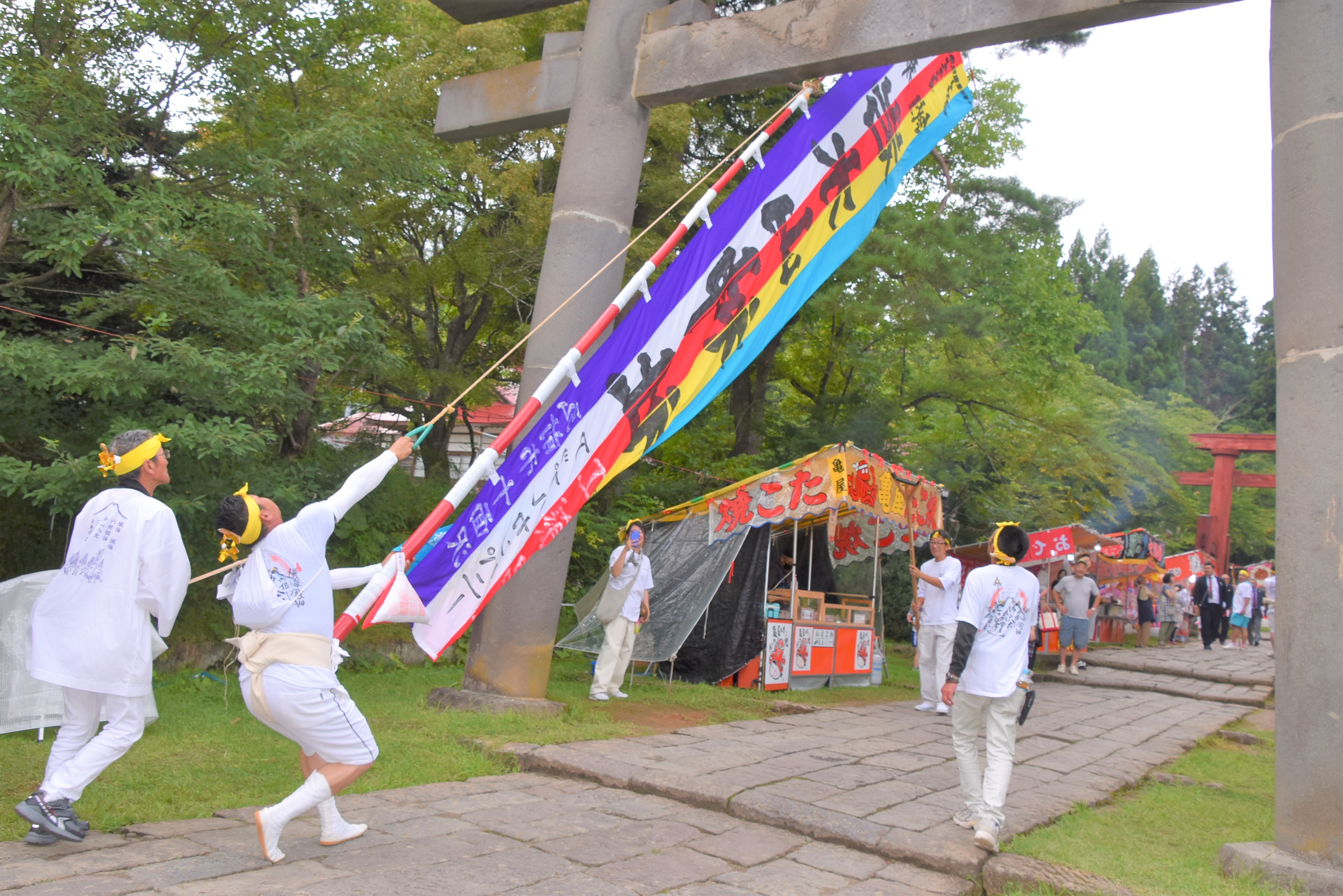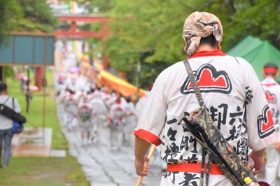 雨の中を歩く団体もありましたが、登山囃子(ばやし)と「サイギサイギ」の掛け声を響かせながら、岩木山神社を目指しました。
