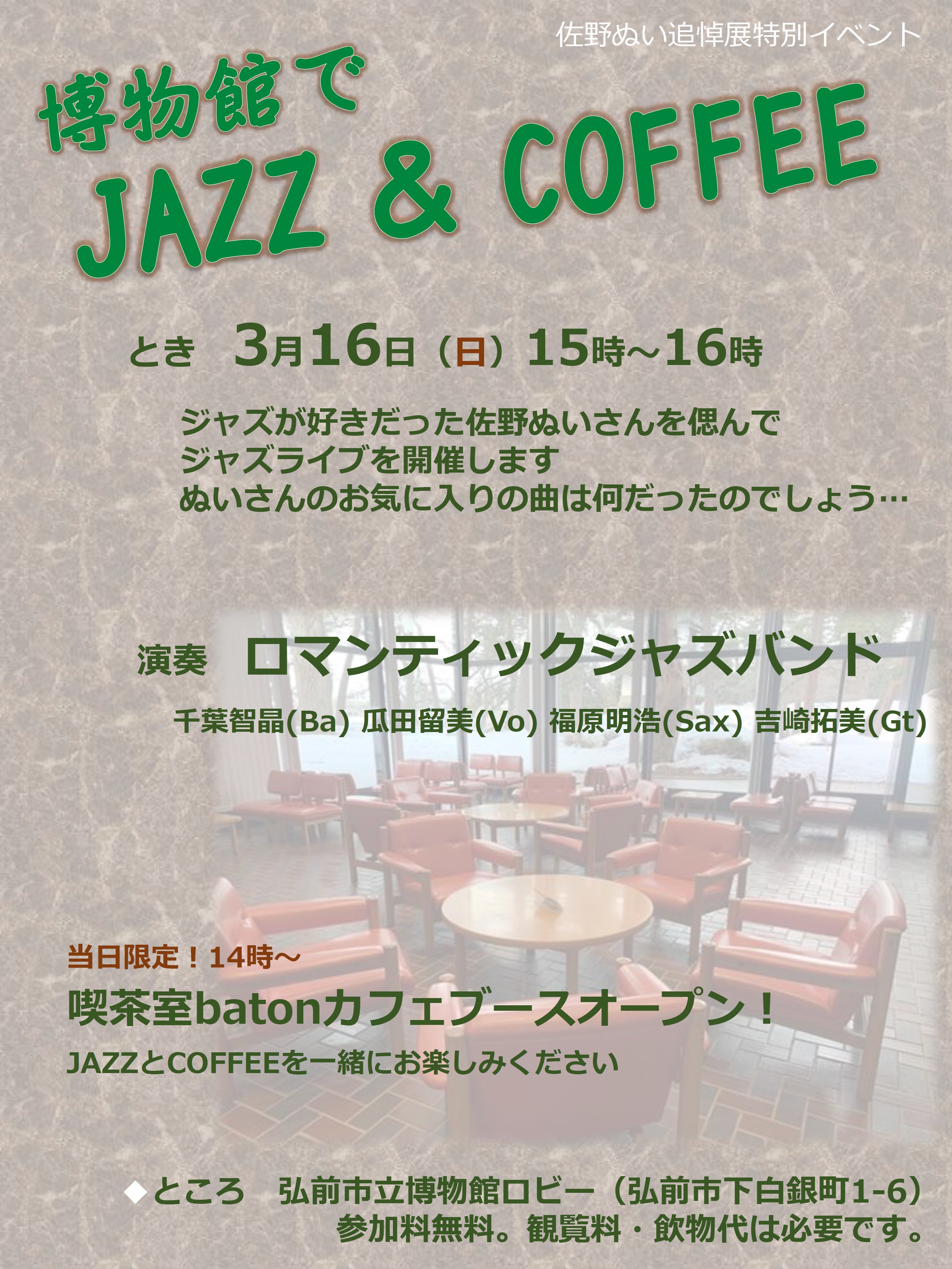 「佐野ぬい追悼展 monochrome、そしてblue」を開催中の弘前市立博物館で、ジャズが好きだった佐野ぬいさんを偲んでジャズライブを開催します。カフェブースもございますので、JAZZとCOFFEEを一緒にお楽しみください。