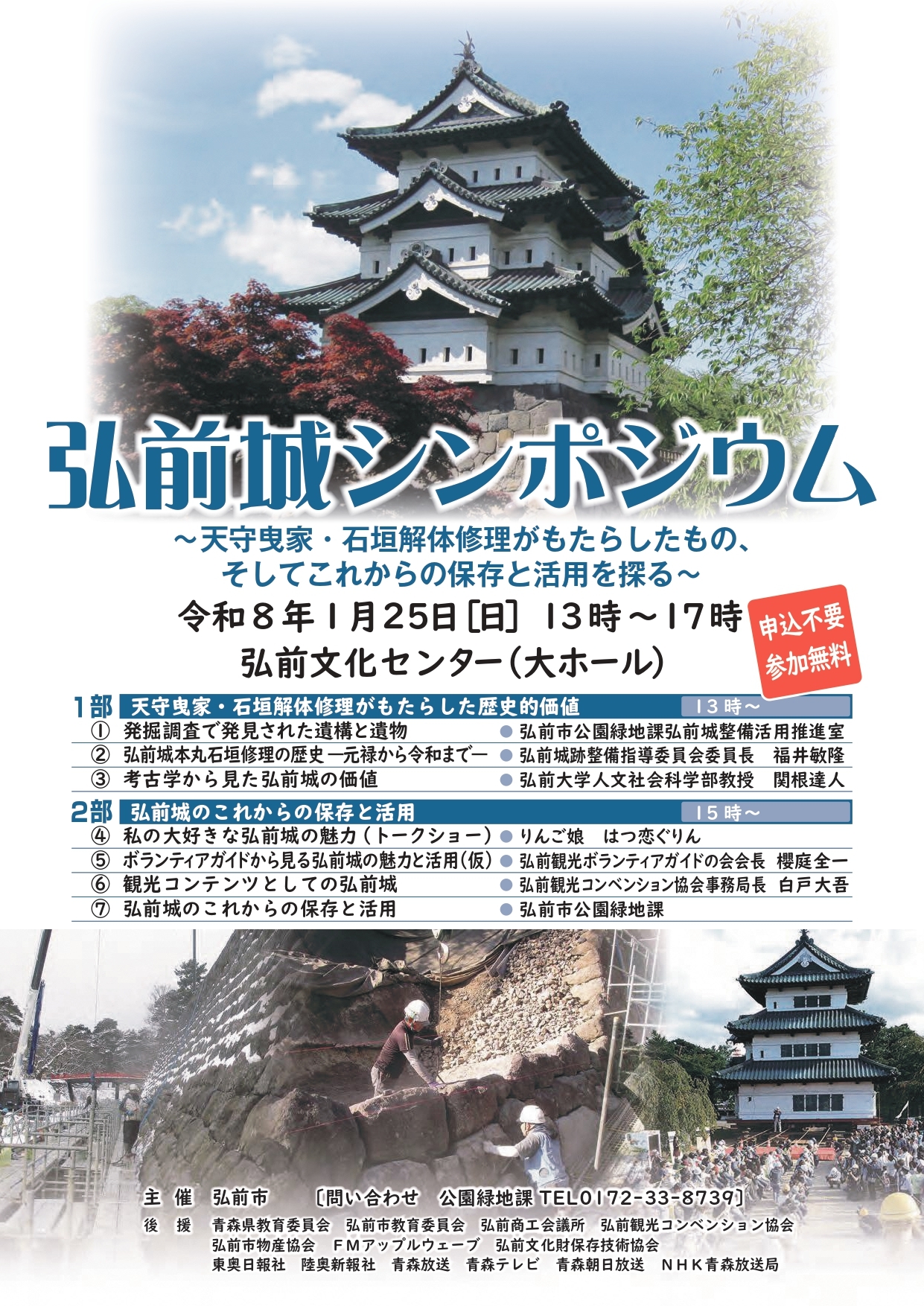 「天守曳家・石垣解体修理がもたらしたもの、そしてこれからの保存と活用を探る」をテーマに弘前城シンポジウムを開催します。ぜひお越しください!