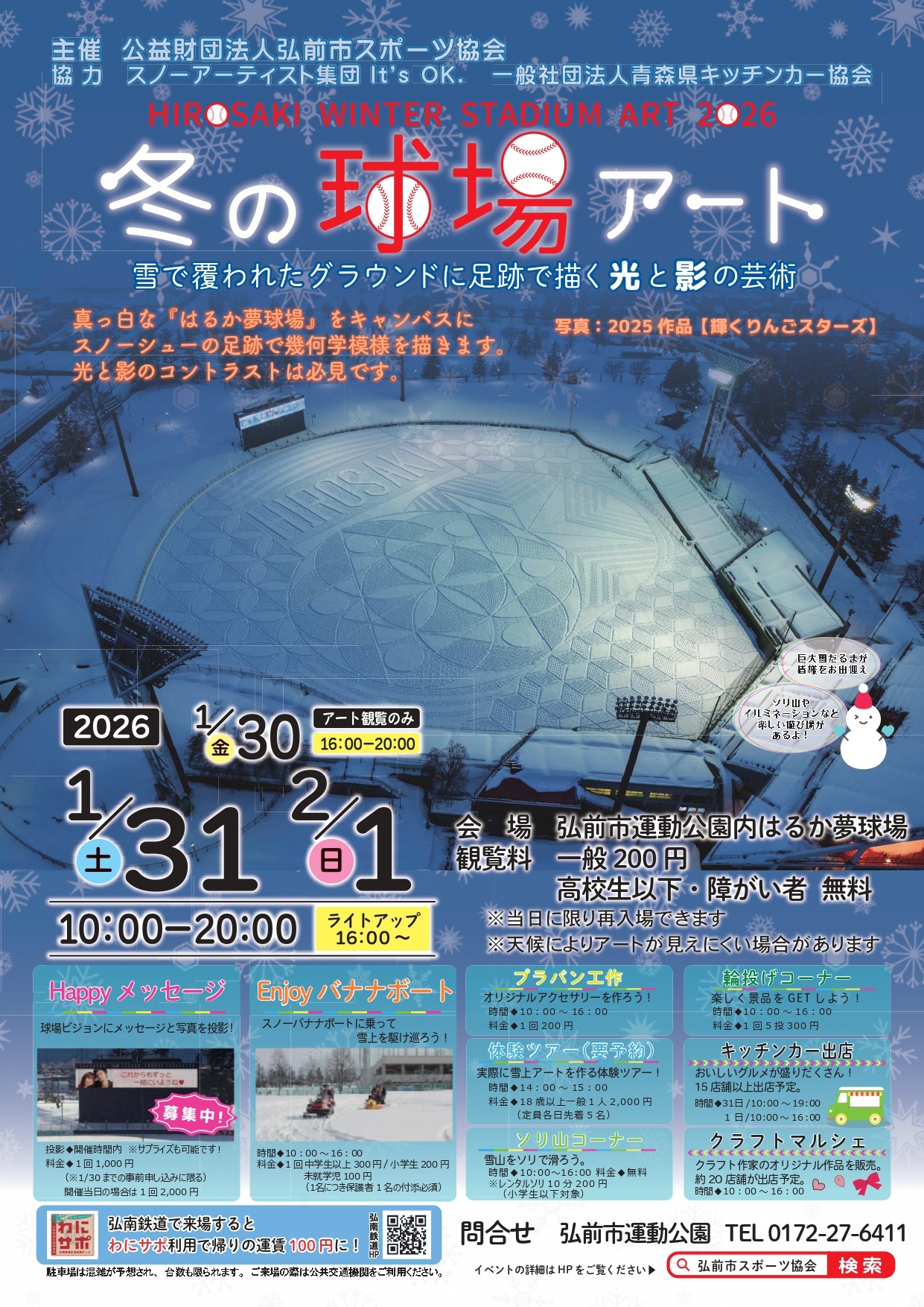 はるか夢球場のグラウンドをキャンバスに、スノーシューの足跡で巨大な幾何学模様を描いたスノーアートをぜひご覧ください。期間中は16:00からライトアップします。