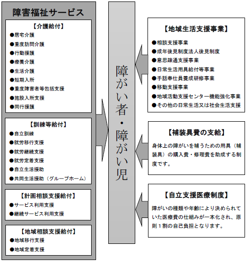 障害者総合支援法による総合的なサービスは、全国共通の「障害福祉サービス」「自立支援医療」「補装具」と、市町村がそれぞれの基準を設けて実施する「地域生活支援事業」で構成されています。さらに、障害福祉サービスは「介護給付」、「訓練等給付」、「計画相談支援給付」、「地域相談支援給付」に分かれています。