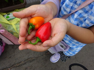 よく観察しながらスケッチをした後は、赤やオレンジに色づいたパプリカを収獲しました。