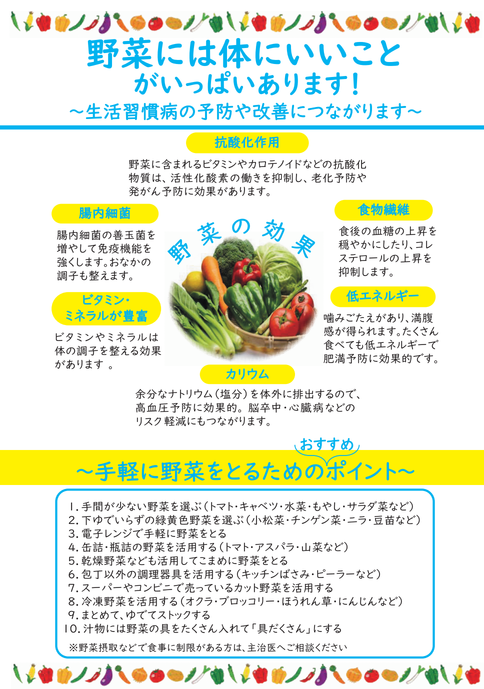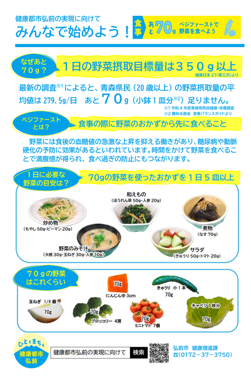 ※1 厚生労働省が推奨する1日の野菜摂取目標量350g以上に対し、青森県民(20歳以上)の野菜摂取量の平均値は279.5g(令和4年度青森県県民健康・栄養調査)となっています。市ではこれまで、平成28年度の同調査の平均値300.2gを基に、野菜「あと50g」を目標としていましたが、最新の調査結果を踏まえ、目標を「あと70g」に変更しました。
