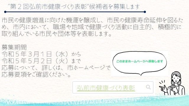 「弘前市健康づくり表彰」は、市民の健康増進に向けた総合的な対策をさらに推進するため、市内において健康づくり活動を自主的、積極的に取り組む市民、企業、市民団体等を称賛するとともに広く公表し、市民の健康増進に向けた機運を高め、市民の健康寿命の延伸を図ることを目的に令和4年4月に創設しました。