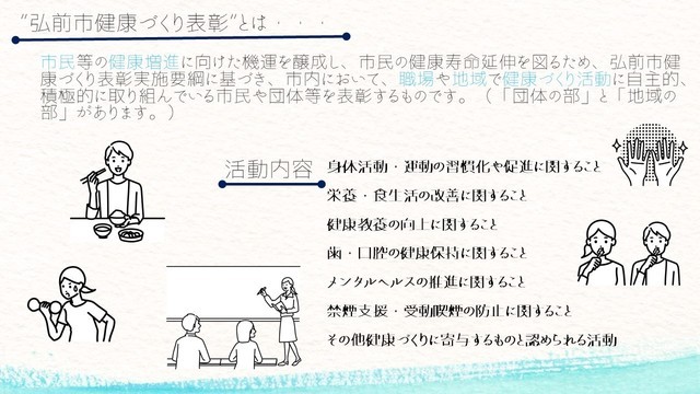 ここでは、「弘前市健康づくり表彰」受賞者のみなさまの活動内容や事例を紹介します。