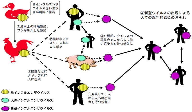 ※鳥インフルエンザウイルスが新型インフルエンザウイルスになる仕組みは、2つあります。ひとつは、鳥インフルエンザウイルスがヒトや鳥類の体内で変異し、ヒトからヒトへ感染する新型インフルエンザウイルスになることです。もうひとつは、ヒトや豚に、ヒトのインフルエンザウイルスと鳥インフルエンザウイルスが同時に感染し、それぞれが混ざり合って、ヒトからヒトへ感染する新型インフルエンザウイルスになることです。(下図参照)