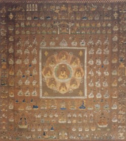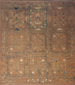刺繍で仏画をあらわすことは、奈良時代から行われており、絵画に比べて技術的にも、手間や費用もかさむこの手法は、供養の熱意と記念碑的な性格をもつものとして尊重された。