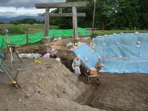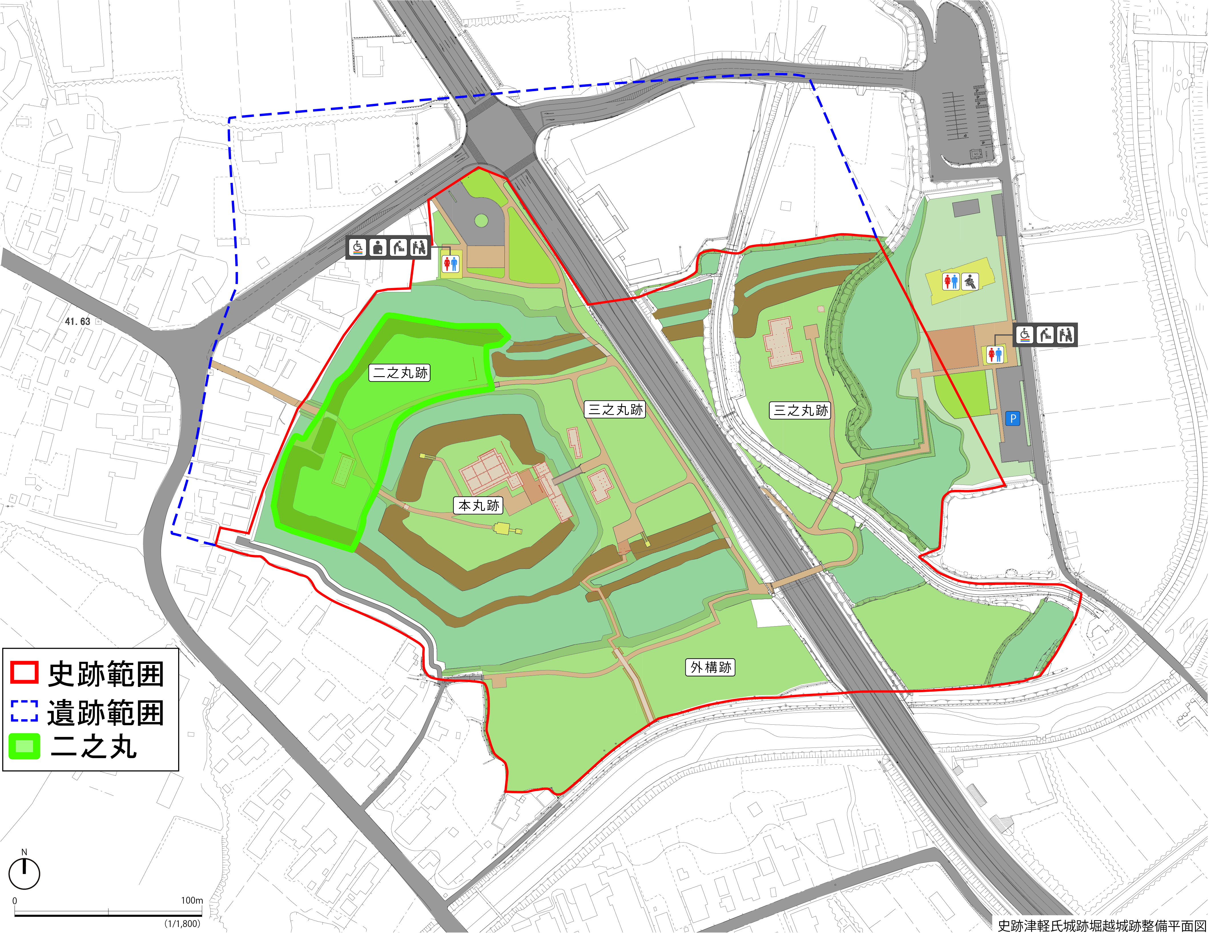 今回の整備では、土塁は残存する基底部の幅や法面の傾斜角度、本丸に残る土塁などから推定し、外堀底面から約6~7m、平場から約3m規模で復元しています。また、外堀は主に明治時代以降の埋め土を除去し、可能な限り深さを復元しました。外堀は南北両側で約20mの幅を有しますが、宅地が近接するため西側は幅が狭い形状での整備にとどめています。土塁や外堀は、津軽為信が大浦城から堀越城へと本拠を移転した文禄3(1594)年に形成されたものと考えられます。この時期の遺構として平場からは、掘立柱建物跡、竪穴[たてあな]建物跡、焼土遺構、柱穴列跡などが確認されています。