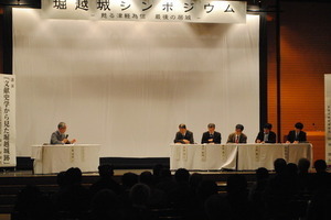 平成27年(2015)11月15日、史跡津軽氏城跡堀越城跡[しせきつがるししろあとほりこしじょうあと](弘前市大字堀越)の歴史と特徴、そして城跡の保存と継承の大切さを多くの方々に知っていただくため、堀越城シンポジウムを開催しました。