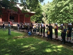 岩木小学校と修斉・草薙小学校(現裾野小学校)の3校を対象に行いました。岩木小学校の児童は、岩木山神社(弘前市大字百沢)や高照神社(弘前市大字高岡)、大浦城跡(弘前市大字五代)を、修斉・草薙小学校の児童は、史跡大森勝山遺跡[しせきおおもりかつやまいせき](弘前市大字大森)や巌鬼山神社(弘前市大字十腰内)、大石神社(弘前市大字大森)などを訪れました。