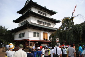 平成24年度から本格化した史跡津軽氏城跡弘前城跡弘前城本丸石垣の修理事業に伴い、平成27年(2015)8月下旬から10月の3か月にかけて天守の曳屋[ひきや]工事が行われました。