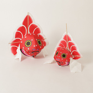 味のある表情で、どちらを向けてもこっちを見ている、不思議な愛敬をもつ玩具「金魚ねぷた」。ねぷたと同じく骨組を作り、和紙を張り、尾ひれと短冊状の胸ひれをつけます。目、口の形や大きさ、彩色の仕方は、人により多少異なります。夏祭りの頃、軒下に下げられたり、子どもが持ち歩く光景は、風情があります。