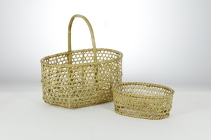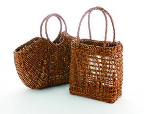 江戸時代から、津軽地方には、豊富なあけび蔓や山ぶどう蔓などの材料を使った様々な編組品がありました。編み方にはナミ編み、2、3本で編むグニ編みと、色々あり、その模様も様々で、熟練した職人は無駄のない手さばきで編んでゆきます。同じ型のものを編むときは木型が必要で、木型に縦の蔓をまっすぐにして、横の蔓はでこぼこのないように型にぴったりと沿って編むと、能率も上がり、精密に組み上がります。自然の素材の特長を生かし、土の温かさを持った美しい編組製品として需要が高く、民芸品としても全国的に高く評価されています。