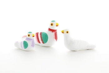 下川原焼土人形は、文化年間(1804年~1814年)に9代藩主寧親が津軽の地に玩具が少ないことを憂いて、下川原にあった藩窯の陶師、高谷金蔵、太田粂次郎らに作らせたのが始まりといわれています。主に焼物を焼けない冬期間を利用して作られていたものが、廃藩後は禄を失った武士たちが本業として、種々の人形を作り、隆盛を極めました。現在では約200種の型があり、特に「鳩笛」「雛人形」などが親しまれており、すべて手作りとなっています。
