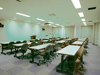 テーブル16本(600×1800) タイルカーペット敷 OAチェア48脚 ホワイトボード(移動式) 音響装置(有料) 天吊固定液晶プロジェクター(有料) 天吊固定スクリーン(有料) |