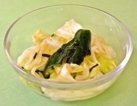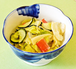 ➊キャベツは一口大にちぎって、電子レンジで2~3分温める。きゅうりは半月切りの薄切りに、カニカマは3等分に切る。