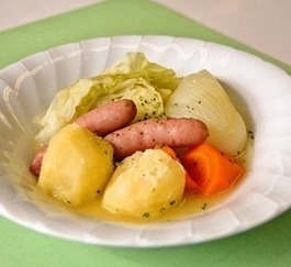 ❷鍋に水を入れ、硬いものから(にんじん、じゃがいも、玉ねぎ、キャベツの順で)煮る。柔らかくなったら、コンソメ、ウィンナーを入れ、最後にこしょうで味を整える。