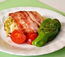 ❷➀のキャベツにベーコン2枚を巻きつけ、フライパンで表裏ゆっくり、焼き目がつくように焼く(フタはしない)。