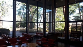 前川國男は、博物館を建てる際に弘前城の景観への調和を重視して樹木を伐採せずに計画したとされています。博物館ロビーからは、手前に松やハリギリの大木、左手には岩木山、右手には弘前城二の丸未申櫓(国重要文化財)が見え、前川が見せたかった自然と歴史が調和した景観が広がります。