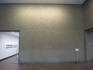 コンクリートの表面をハンマーなどで叩いてわざと削り、その表面に変化をもたせる工法で、博物館ロビー壁面に見られます。現在では削ったように見せる技法が主ですが、この壁は当時の職人がコツコツ叩いて削ったもので、平成25年度の改修工事の際には他の壁の内側から斫りの練習跡が見つかっています。