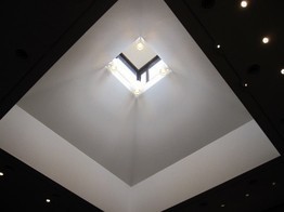 外から見ると突き出している部分は、ホール天井のトップライトとなっていて、暗くなってから館内のライトをつけると光が外に漏れだし、非常にきれいな光景を見ることができます。雪灯籠をイメージして作られたと言われています。
