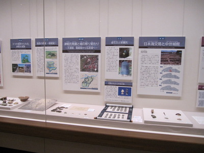 弘前市笹森館遺跡出土の「馬の線刻画」土器や石帯などの遺物ととともにパネル資料を展示し、蝦夷と大和朝廷との関わりなどを紹介