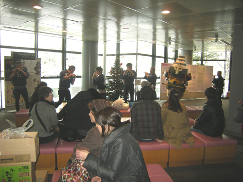 弘前駅では、駅中ミニコンサートやよさこい演舞などの他に、改札口でりんごの振る舞いや、ホットアップルジュースのふるまいが行われたよ♪