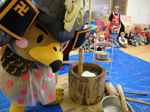 もちつきでは、みんなの「よいしょー、よいしょー」の掛け声に合わせておもちをついたよ☆