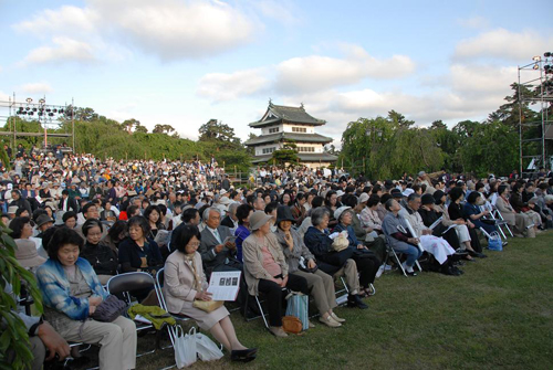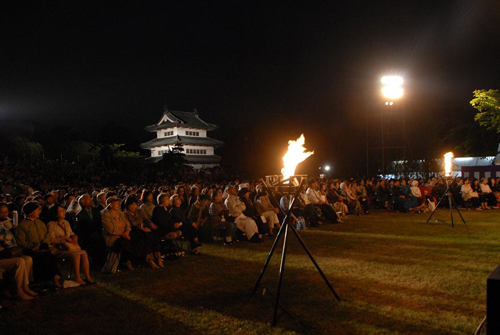 会場を訪れた約1,300人の市民らが、かつて弘前城を舞台に行われていた薪能を鑑賞しました。