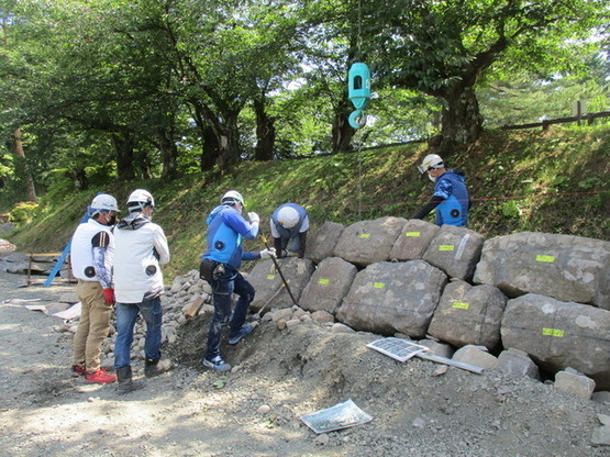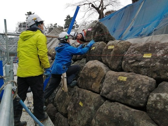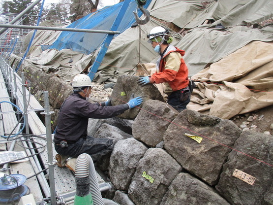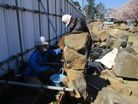 令和2年10月より着手し、冬期間は休工していた「令和2年度史跡弘前城跡本丸石垣東面(北側)積直し工事」に伴う作業を、4月より再開しました。実際に石を積み直すのは、6月となる予定です。
