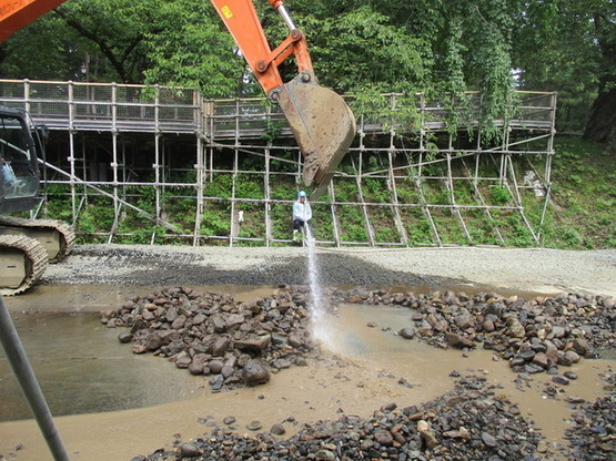 ▽下乗橋から石垣積直し工事現場を望む(5月上旬)