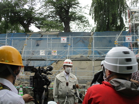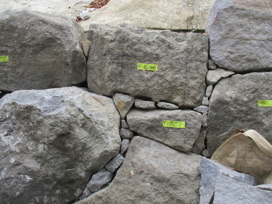 6月23日(水曜日)13時30分より、市長立会いのもと、第1石目の積み直しを行いました。第1石目として据えられたのは番付「イ-504」の石材で、本丸東面南端から約70メートルの地点に位置します。「イ-504」の寸法は、高さ48センチメートル、幅76.5センチメートル、奥行き105センチメートルで、重さは674キログラムあります。また、本丸の「石垣普請番屋」も、この日よりリニューアルオープンしました。