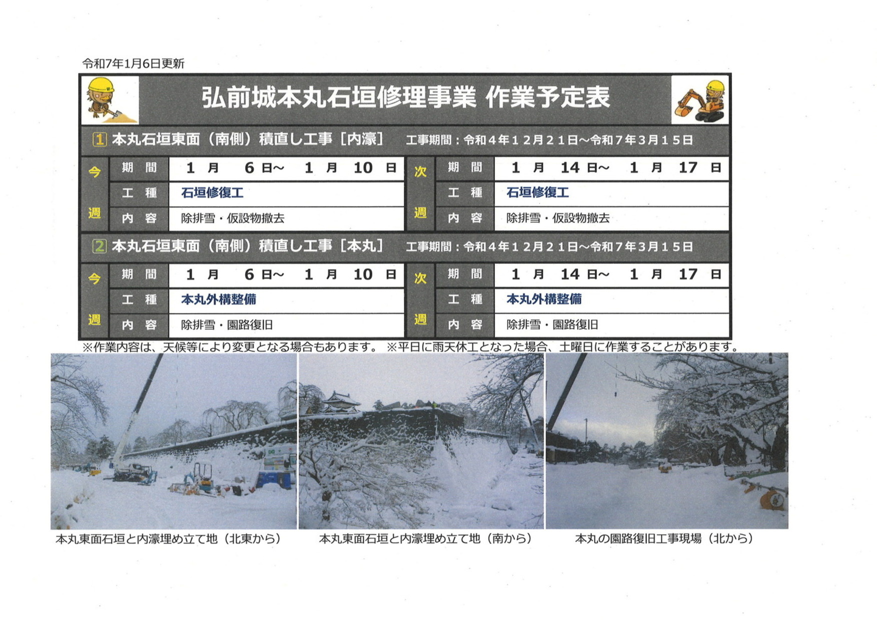 弘前城本丸石垣修理事業について、令和7年1月6日から1月17日までの作業予定をお知らせします。