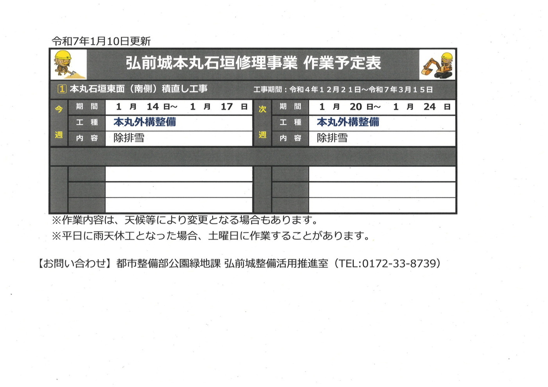 弘前城本丸石垣修理事業について、令和7年1月14日から1月24日までの作業予定をお知らせします。