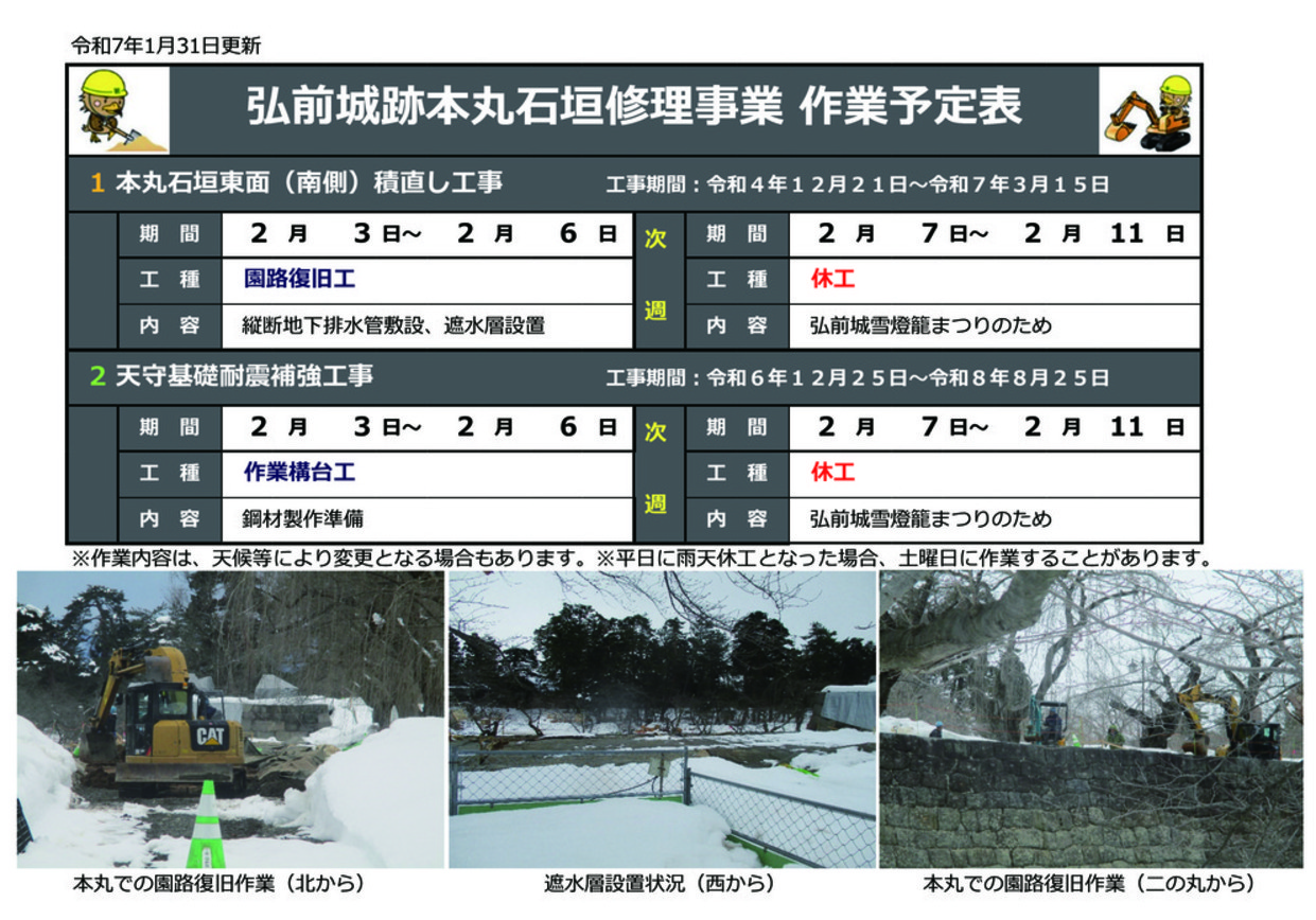 弘前城本丸石垣修理事業について、令和7年2月3日から2月11日までの作業予定をお知らせします。