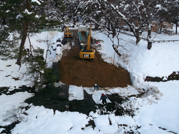 弘前城天守を曳屋して本丸内部へ移動するのに備え、平成26年11月25日より内濠の水を抜き始め、濠の埋め立てを開始しました。