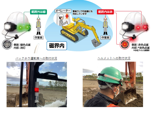 - 重機と作業員の接触事故リスクを低減できるシステムを採用し、安全性の向上を図っております。このシステムは、重機の設定範囲内に作業員が立ち入った際に、「音」と「光」によりお互いが危険を認識することが可能です。