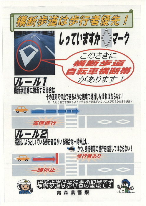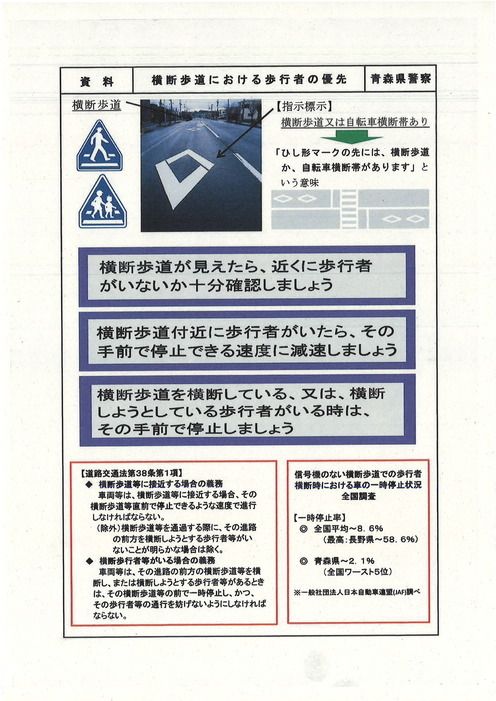 (一社)日本自動車連盟が行った「信号機のない横断歩道での歩行者横断時における車の一時停止状況全国調査」(H30.8実施)によると、青森県は2.1%と全国ワースト5位でした。(最高は長野県の58.6%)