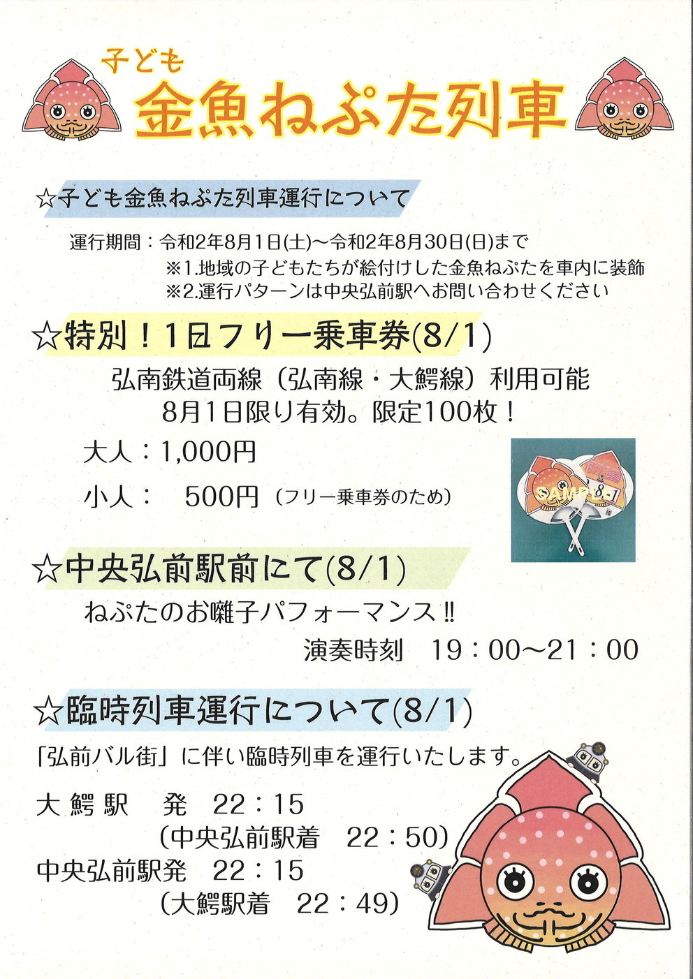 弘南鉄道株式会社では、沿線小学生が絵付けした金魚ねぷたを車内に装飾し運行する