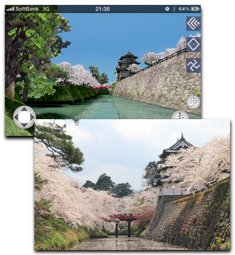 ▲「ポケット弘前城」内の弘前公園と実際の写真。忠実に再現されていることがわかる