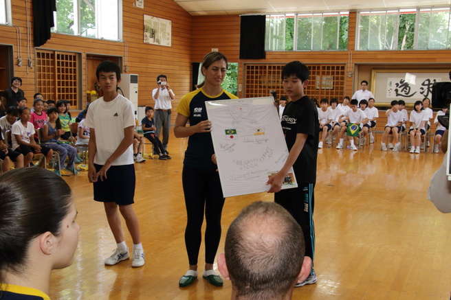 ブラジルチームからの記念品贈呈 左、ルシア選手 右、船沢小学校の生徒=7月18日