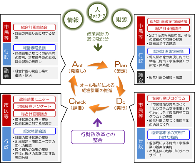 計画策定後も、刻々と変化する地域課題や市民のニーズに適切かつ臨機応変に対応し、経営計画を常に有効に機能させるためには、各分野の地域課題の状況や、施策の進捗状況を適切に評価・確認するとともに、その結果を踏まえ、人材・財源・情報といった政策資源を適切に配分することが重要であります。