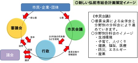 弘前市経営計画の策定にあたっては、これまでの基本構想およびアクションプランにおける課題等を踏まえ、行政のみの検討で策定するのではなく、市民の皆様にも主体的に策定に関わっていただき、20年先の弘前市像を検討していくことができる体制で取り組みました。