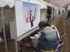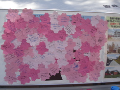 弘前の好きな風景や街並みについて、自由に記入してもらうメッセージボードを設置しました。当日はさくらの花びらをかたどった用紙にメッセージを記入していただき、さくらを満開にしていきました。