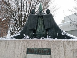 このほか、広場内には物語「安寿と厨子王」の像が建立されています。これは、市制百周年記念として、弘南バス株式会社で当時、代表取締役会長であった菊池武正氏から、平成4年に市に寄付されたものです。 安寿と厨子王は津軽の領主岩木氏の出という伝説や、安寿が岩木山の神様になったという話から、安寿と厨子王、そして二人の母の像を、岩木山が眺望できる弘前市民中央広場に設置したものです。
