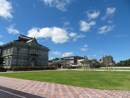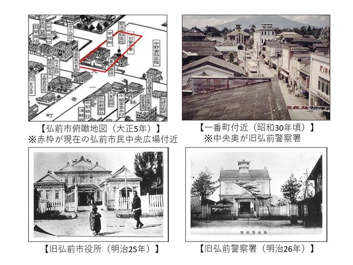 「憩いの広場」の東側には、かつて、旧弘前市庁舎や旧弘前警察署が立地していました。