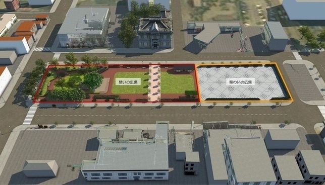 芝生をメインとした「憩いの広場」と、こぎん刺しをモチーフとしたデザインの石畳を施し、屋外イベントに対応した「賑わいの広場」の2つの空間で構成しています。